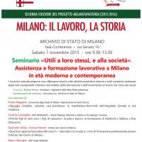 Sabato 7 novembre (ore 9.30-13.30), presso la Sala conferenze dell’Archivio di Stato di Milano, in via Senato 10, si svolge un seminario di approfondimento organizzato nell’ambito della settimana di apertura della seconda annualità del Progetto Milanosifastoria (Milano: il lavoro, la storia, novembre 2015-ottobre 2016), intitolato «Utili a loro stessi, e alla società». Assistenza e formazione lavorativa a Milano in età moderna e contemporanea.