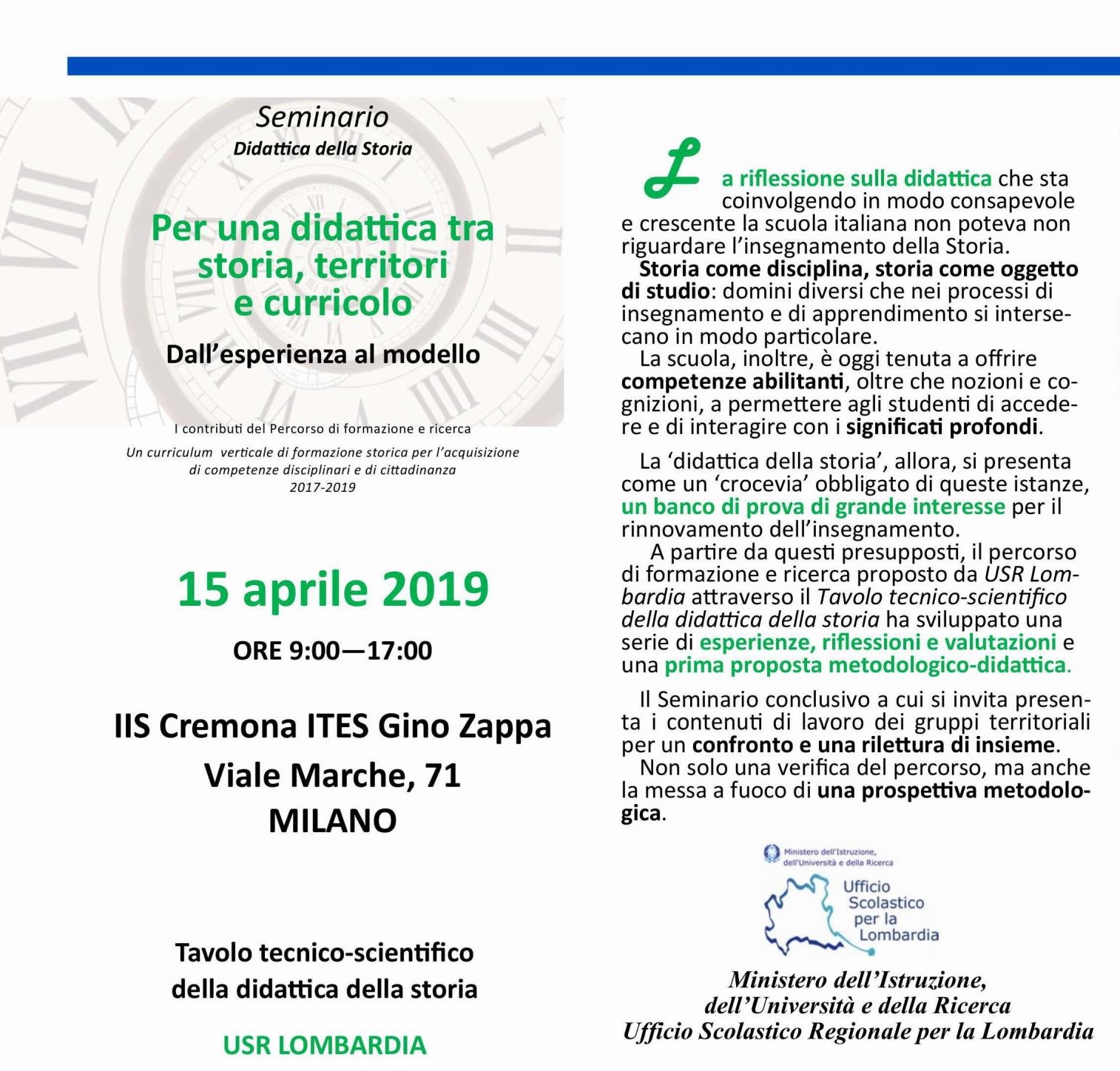 Lunedì 15 aprile 2019, ore 9.00-13.00 e 14.00-17.30, presso l'Istituto d'Istruzione Superiore (IIS) “Luigi Cremona” - Istituto Tecnico Economico "Gino Zappa", in viale Marche 71 a Milano, si terrà il seminario conclusivo e aperto a tutti del Corso triennale (2016-2019) promosso dal Tavolo tecnico-scientifico della didattica della storia dell’Ufficio Scolastico Regionale (USR) per la Lombardia.